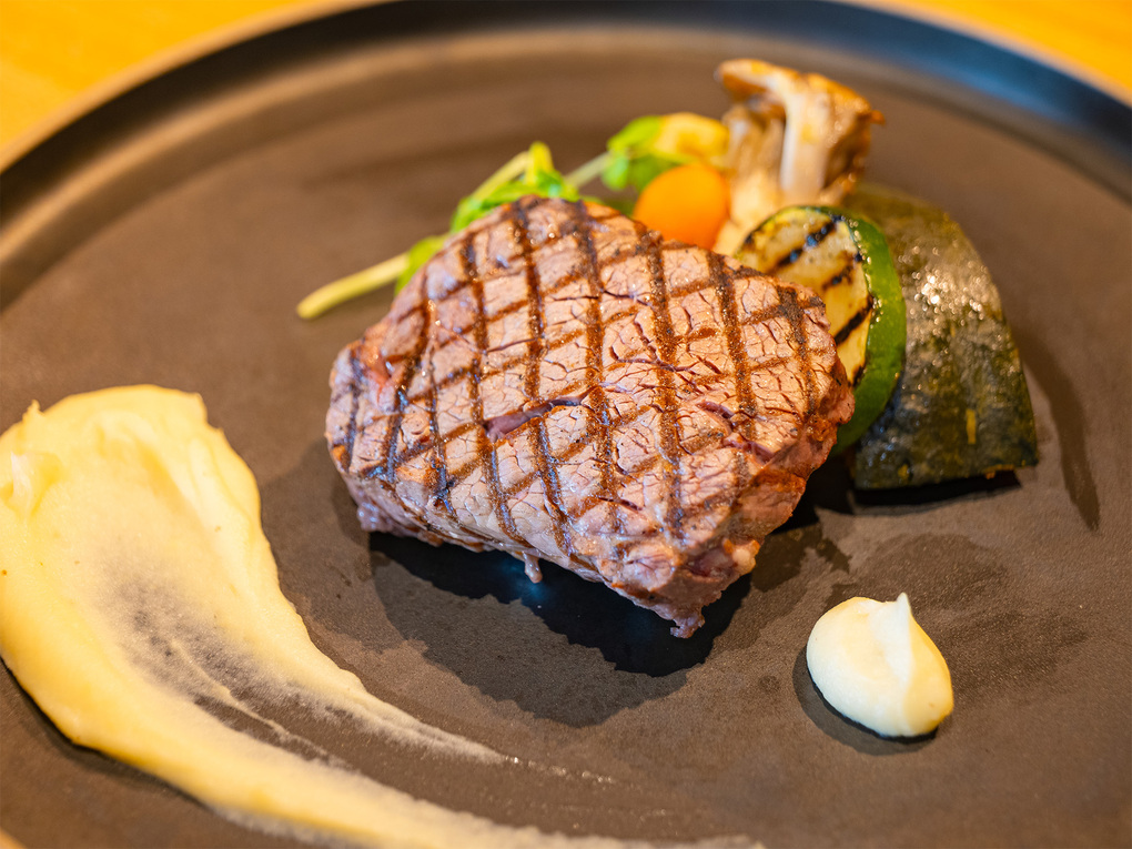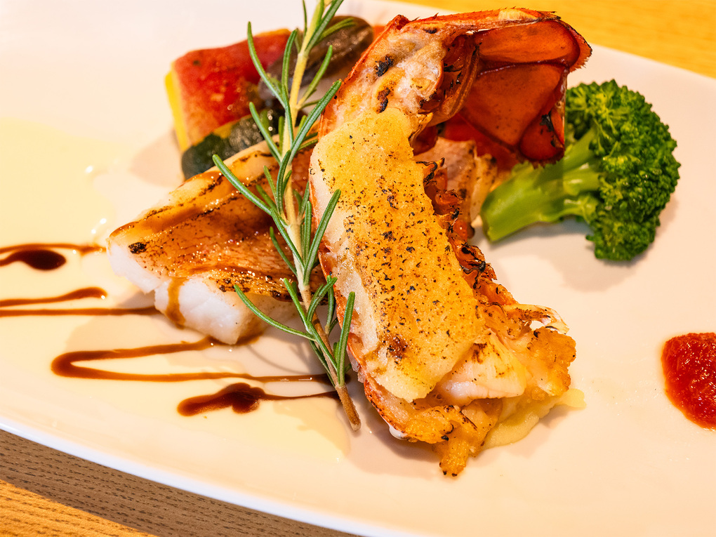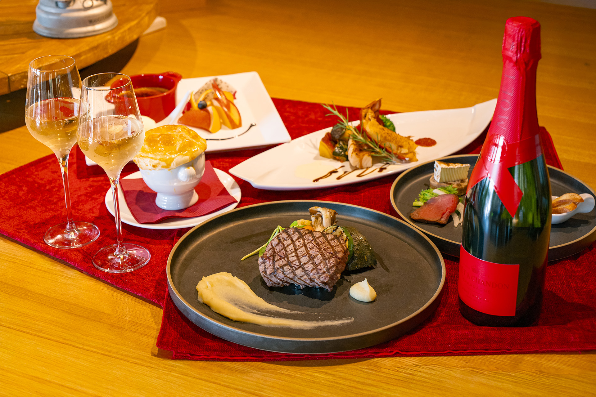 本館レストラン(The Day GRILL)では、モエ・エ・シャンドンの華やかな果実味に合わせた冬限定のコースディナーを提供。前菜の「炙りカマンベールと冬野菜のサラダ」にはじまり、「オマール海老のパナード焼き」や「国産牛フィレ肉のグリル〜赤ワイン香るソース〜」など、シャンパンの泡と響き合う料理長渾身の逸品をお楽しみいただけます。