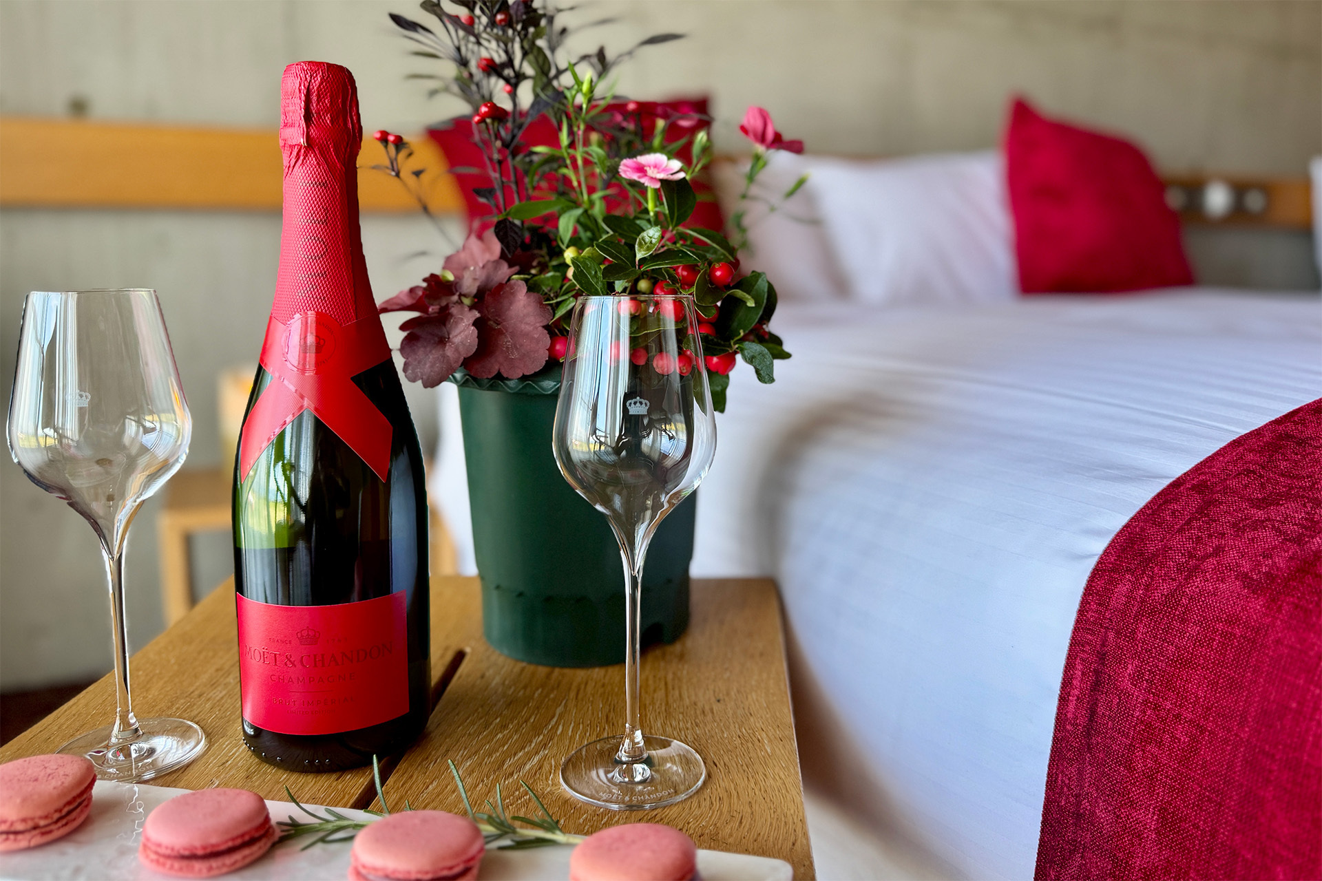 期間中は、ホテル別館「NEST(ネスト)」のセミスイートルームで、冬限定ボトル「モエ・エ・シャンドン モエ アンペリアル SHARE THE LOVE」を楽しめる宿泊プランをご用意。深紅をアクセントにした特別仕様の客室には、シャンパンボトル1本とマカロンをセットでお届けします。