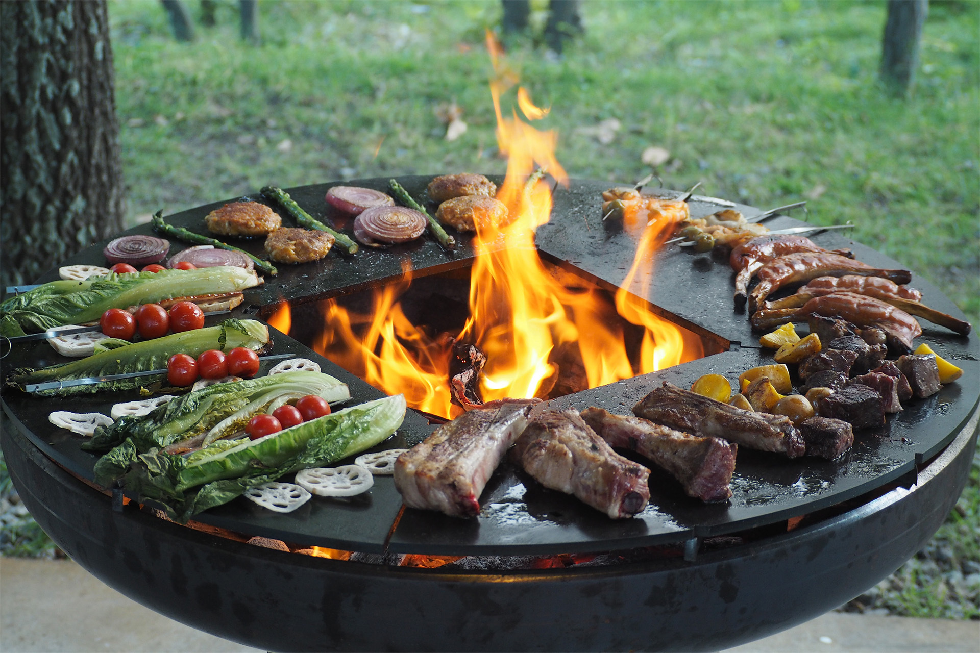 炎を眺めながら鉄板で焼き上げる冬の薪焼きBBQは、この季節にしか味わえない特別な体験です。