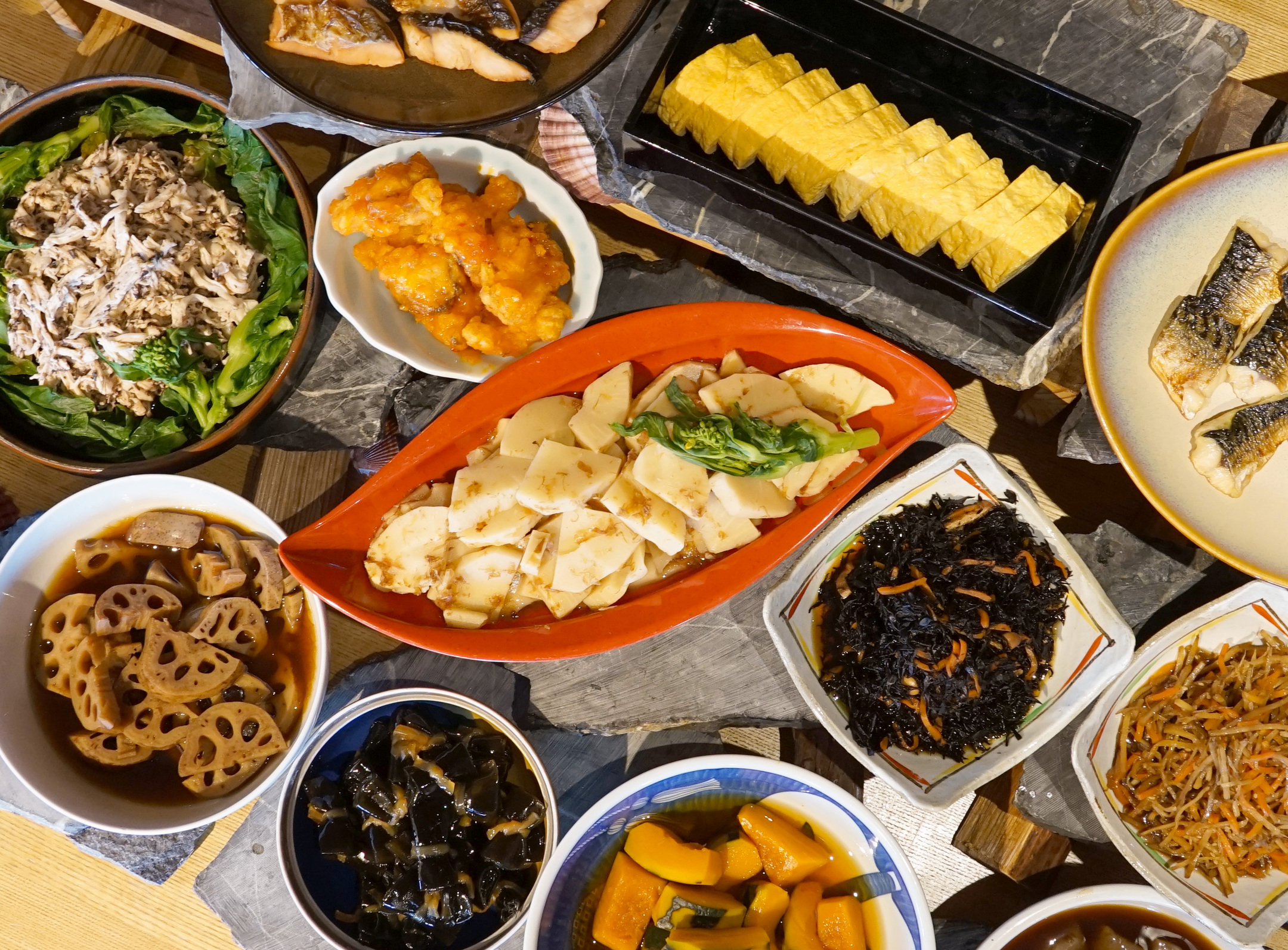 菜の花と鶏むね肉の梅和え、若竹煮、西京焼きなど、和のメニューでも春の食材を取り入れています。山菜蕎麦や筍ご飯、ちまきといったメニューもそろえ、春の味覚を楽しめる内容となっております。
